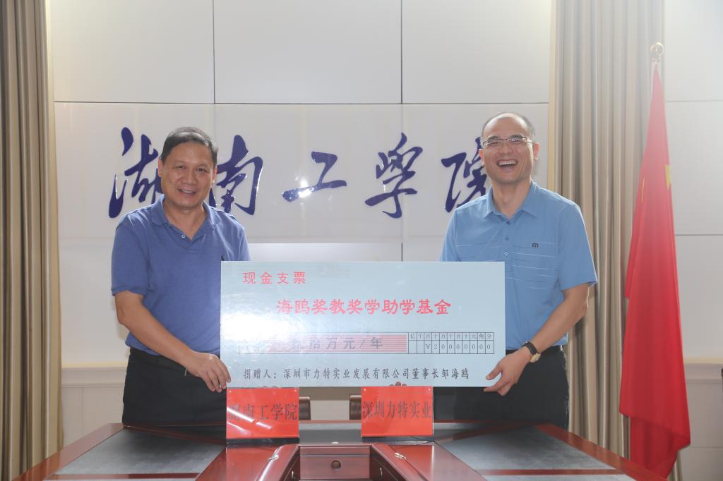 9月16日下午,金冠网址线路检测中心与深圳市力特实业发展有限公司校企战略合作暨“海鸥奖教奖学助学基金”签约仪式在教学大楼12楼会议室举行。校长罗建华,校党委副书记、教育基金会理事长张平,原校领导、教育基金会副理事长胡波年,优秀校友、深圳市力特实业发展有限公司董事长邹海鸥,董事刘萍,总经理廖文胜出席签约仪式。仪式由发展规划与校企合作处处长、教育基金会秘书长刘文华主持。